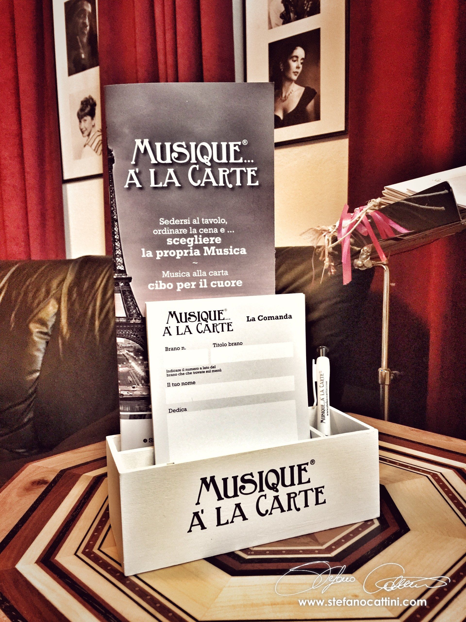 Thus was born the idea of making numerous pieces available to the public, which could be chosen directly; in this way it is the public that decides the schedule of the evening. The French name is connected to the idea of the kitchen, literally "paper music" just as if the heart needed its own particular nourishment, a story, an emotion, a laugh.