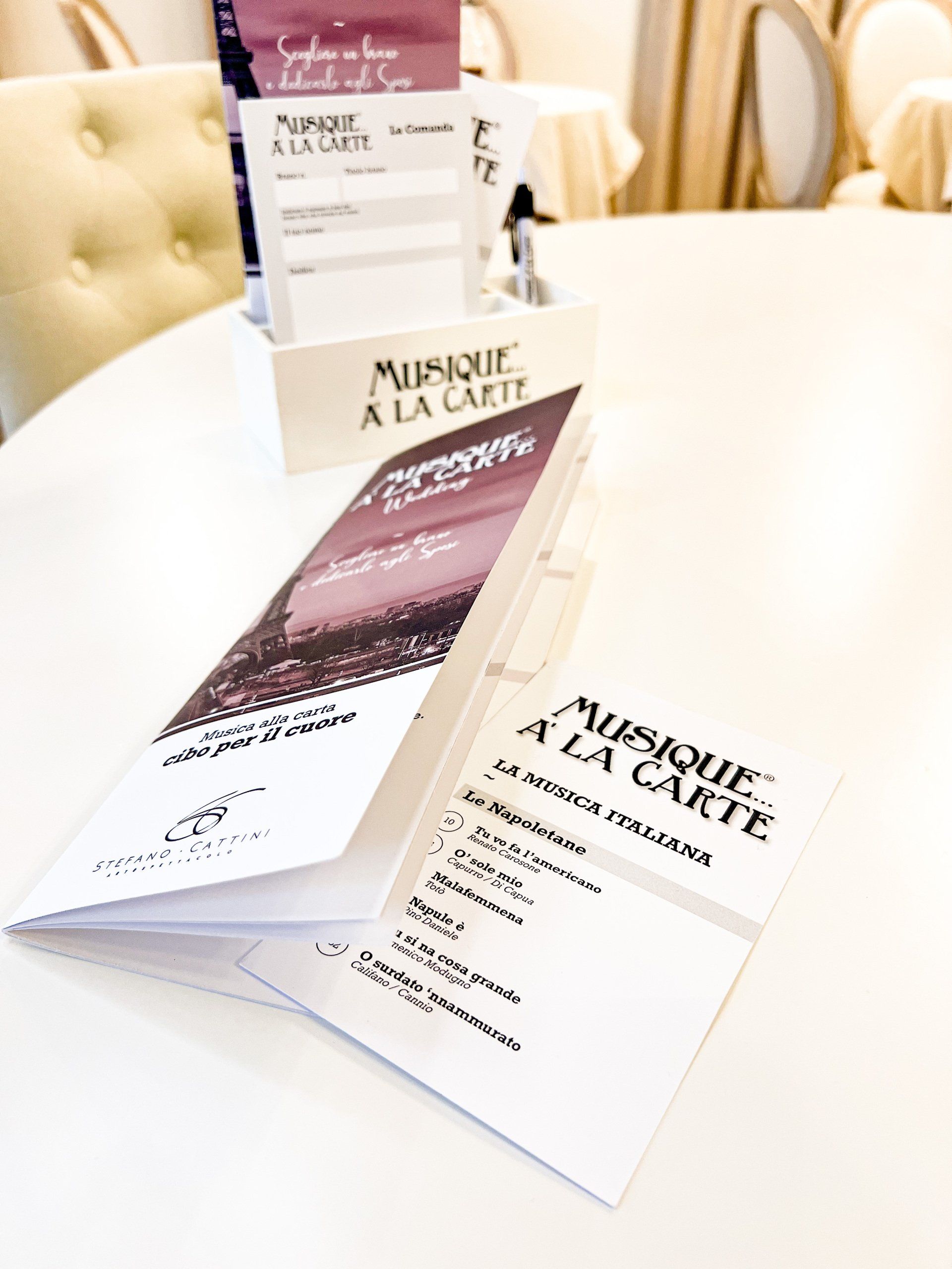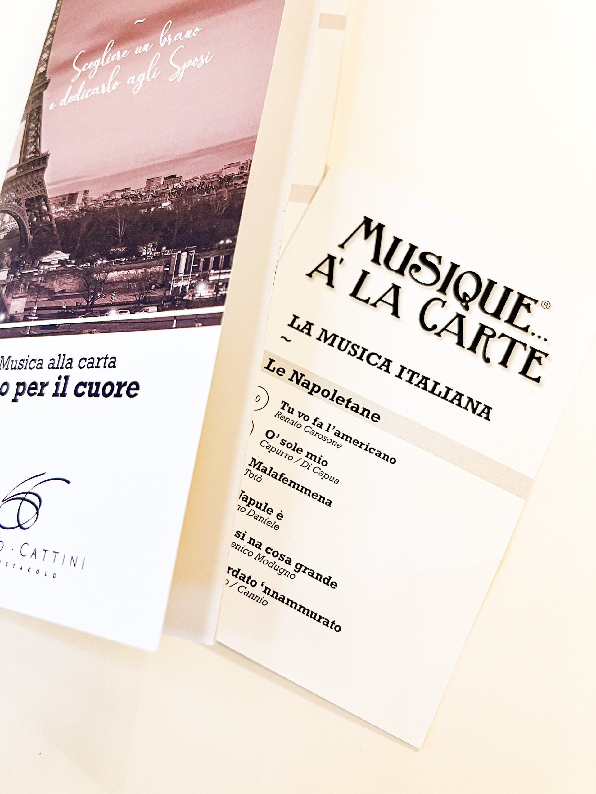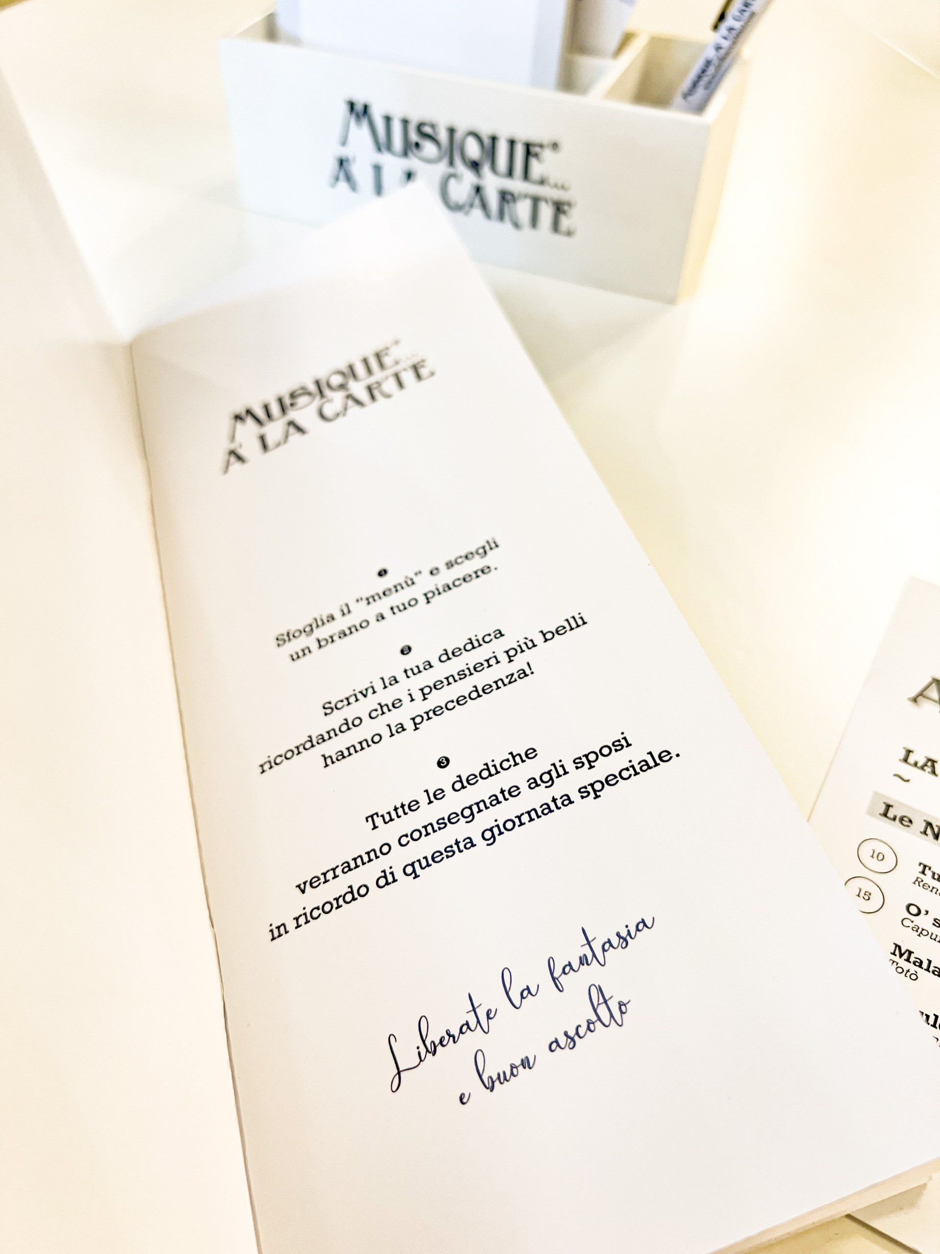 Abbiamo creato una versione speciale di Musique à la carte dedicata al giorno del matrimonio, le caratteristiche fondamentali sono che il menù non contiene brani "tristi", la formula ha mantenuto la sua versione originale su cartaceo... e ora vi spiego perchè: