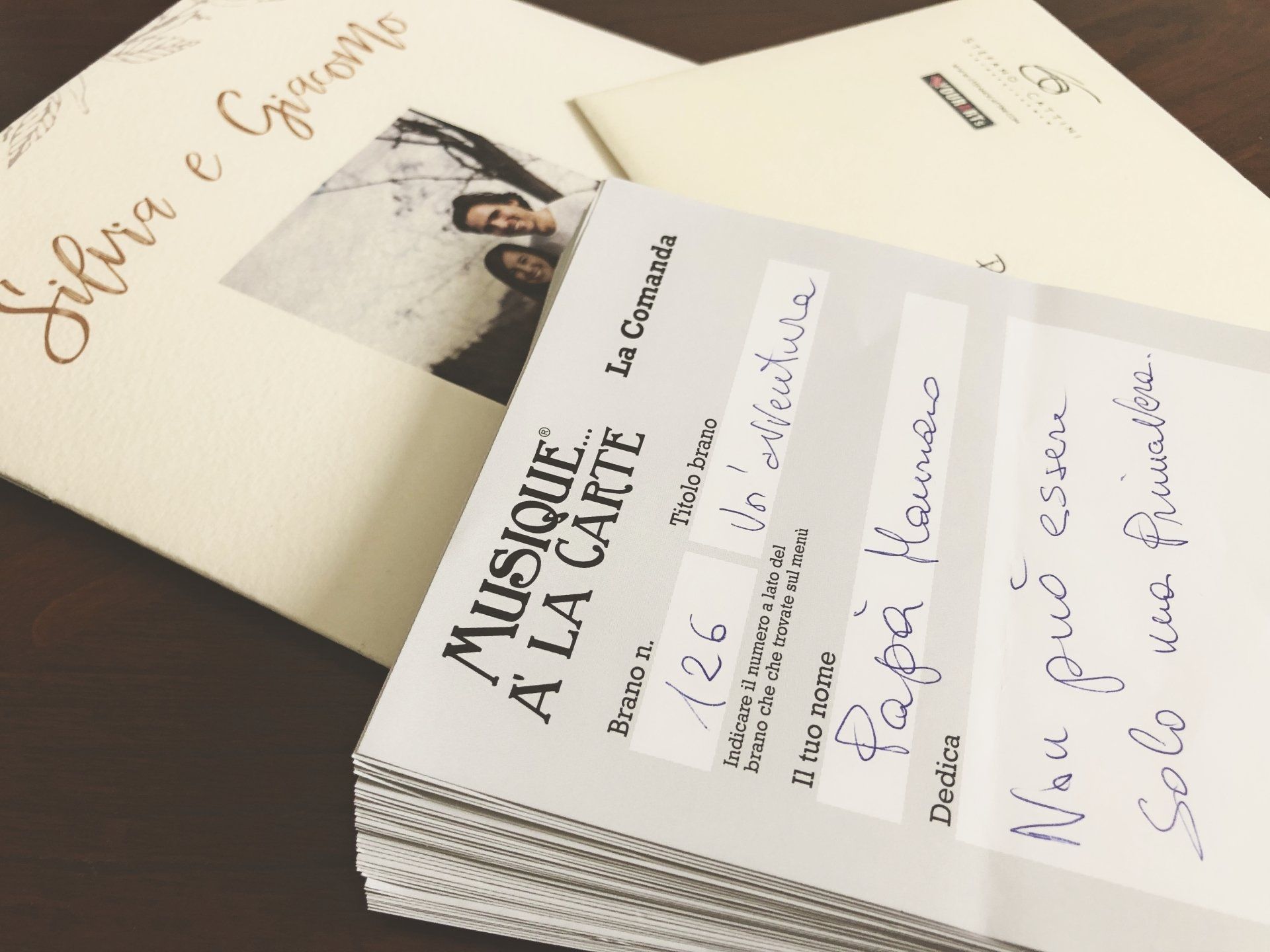 E' stato davvero un matrimonio magico, già a partire dalla cerimonia, molto emozionante. Un aperitivo molto sfizioso e devo dire che gli ospiti si sono davvero sbizzarriti con musique a la carte, era tangibile la voglia di cantare e di stare insieme. Sono state scelte davvero canzoni molto popolari, conosciute da tutti e le hanno davvero cantate assieme a noi. Il primo brano è stato " Questo piccolo grande amore" e il coro generale ha fatto commuovere la sposa tanto da farmi sentire in colpa!!! Ma è stato un Musique à la carte di vera soddisfazione e poi vederli così contenti è davvero la nostra più grande soddisfazione, buona vita insieme ragazzi!